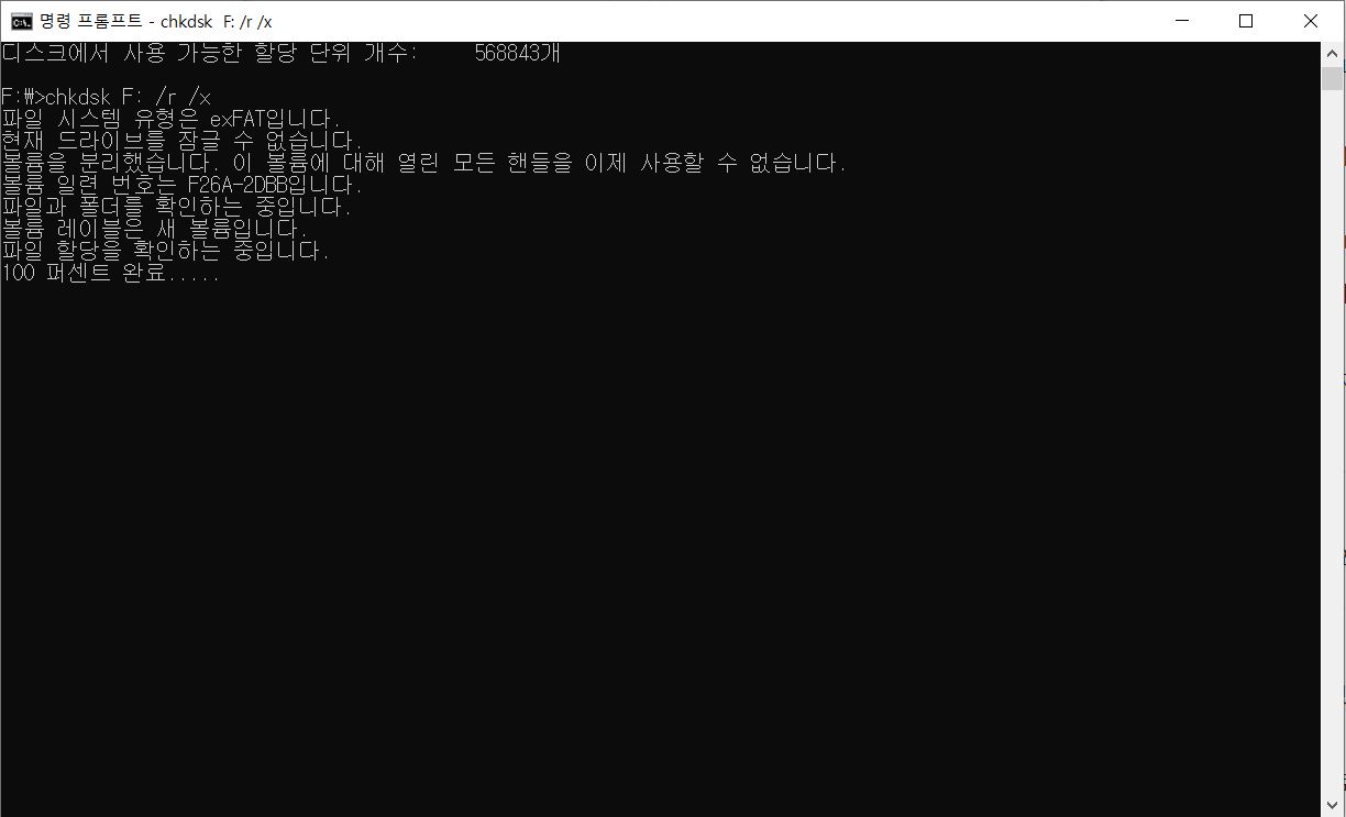 - /x 옵션: 드라이브를 강제로 분리(Dismount)하여 검사를 방해하는 다른 프로세스를 차단합니다. 주로 /f나 /r과 함께 조합하여 사용합니다.