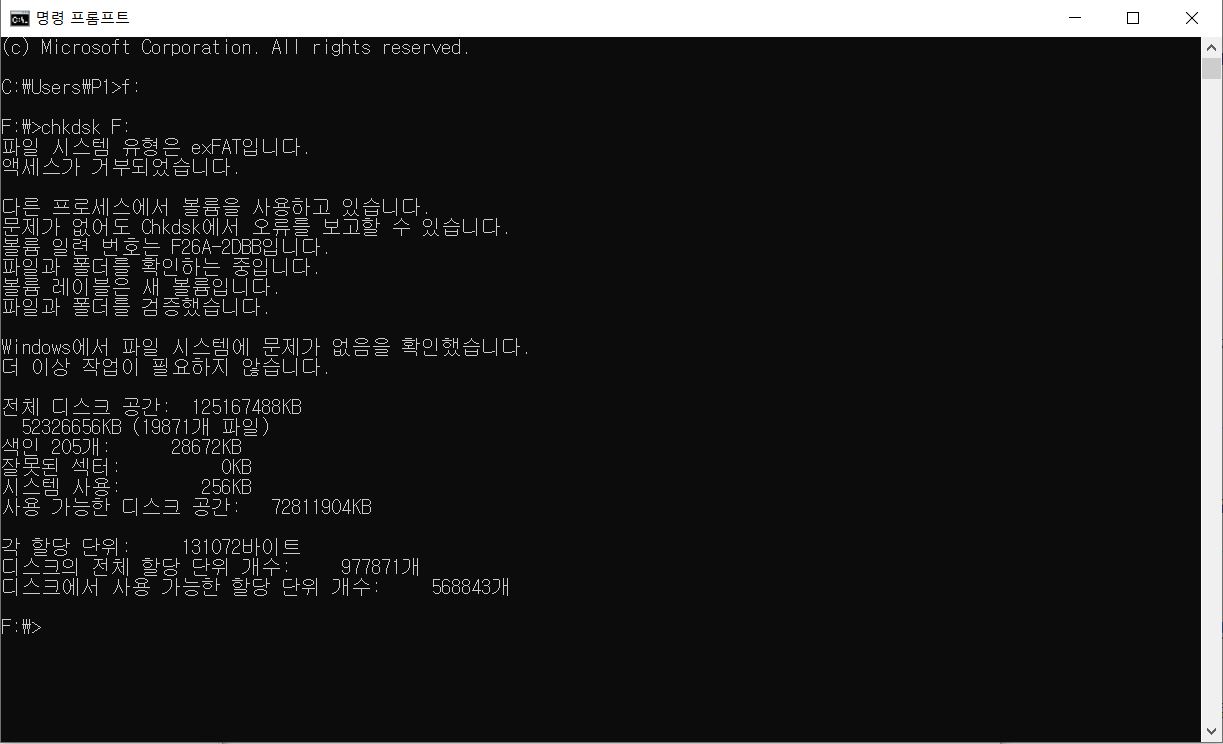 예를 들어 시스템의 물리적 손상이 의심될 때는 chkdsk F: /r /x와 같이 입력하여 철저한 검사를 진행할 수 있습니다.